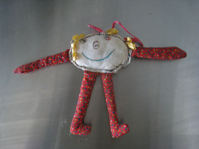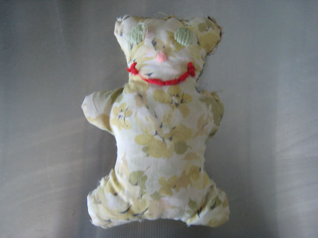 This is a picture of the first toy I ever made. I wish I could remember her name! I designed it, and my mother sewed the seams on the sewing machine. I drew the face and used curling ribbon for hair and a bow. I think I might have been around 5 or 6 when it was made.