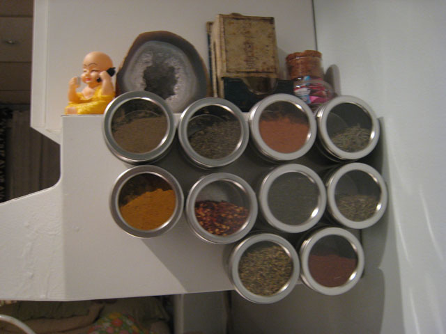 If you’re wondering, located above the new spice rack is a squeaky monk on a cel phone my mother gave me, a geode from my dad, an antique metal match holder and my collection of Kool-Aid points. I am waiting for a decent prize to be offered. I think I have a million points by now, so I might just buy the entire company. (Last time I checked all I qualified for was rub on tattoos.)