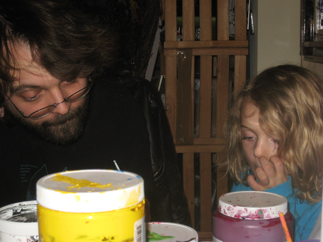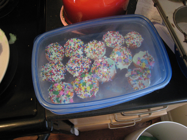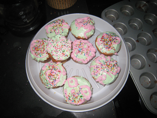 After that, we made cupcakes. Lemon cake with red food colouring in it so they are orange, vanilla icing coloured green and pink and a mazzillion sprinkles. We ate loads of them and brought a wack load to Saira and Michael, who are busy renovating and haven’t got any food.