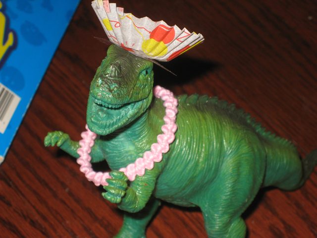 After all that, we played quietly on the floor. The T Rex chomped a giraffe and her zebra daughter, then went to Hawaii to rest.