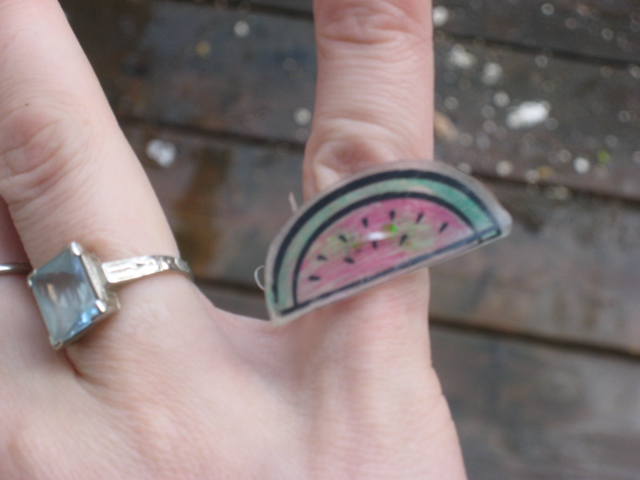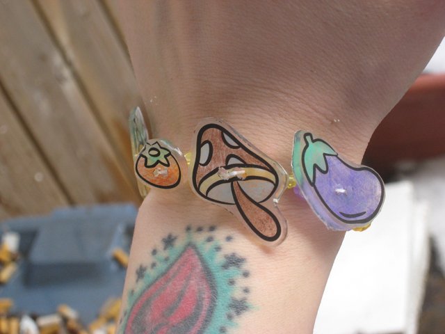 First, we went to Dollarama and bought all kinds of treats. Ari and I made Shrinky Dinks. Remember them? They shrink? The set we shared was fruits and vegetables, and it came with beads and string, so we made rings and bracelets.