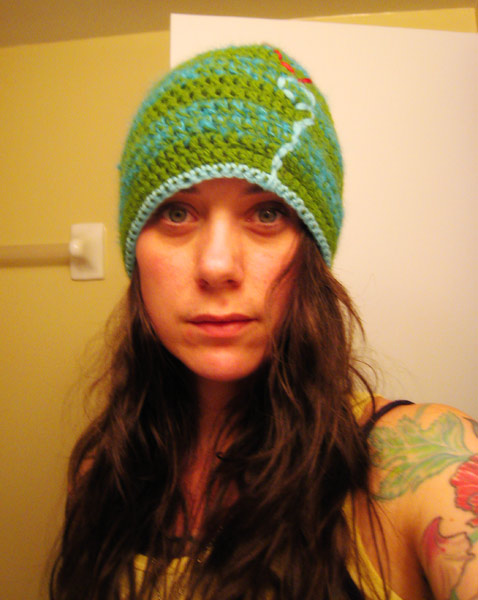 It’s sort of more green than blue, and it has a heart flower embroidered onto it. It’s big for her big head.