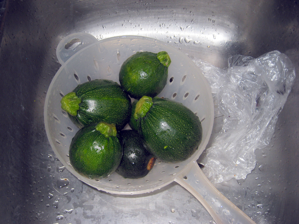 They were stuffed quinoa, crushed tomato, onion, garlic and the innards of the zucchini. A little salt, pepper, thyme, basil and parsley. We ate them with lamb sausages and had sour cream on the side.