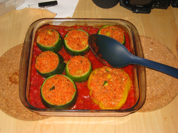 I got to make supper today because the other people that live here -and I am mostly speaking of the taller one- were out at Buskerfest all day changing the colour of their faces. I already wrote about making pickled beets, so I won’t repeat that story, but I also made stuffed zucchini and half a pepper, due to an excess of stuffing and a shortage of zucchini. My mother never, EVER made stuffed anything when I was a kid (and I bet she’ll challenge me on this) because she claimed she didn’t have time to stuff something into something else. This left me craving anything stuffed.