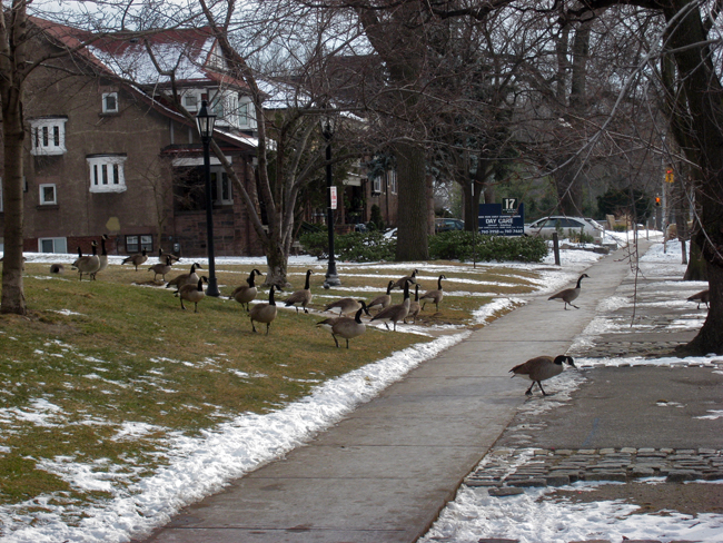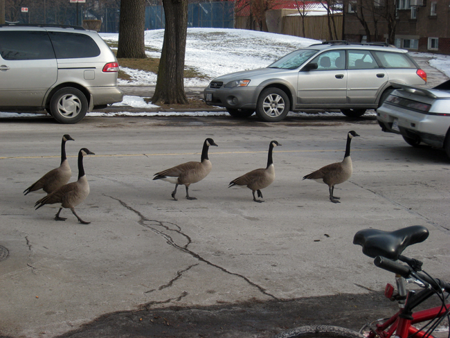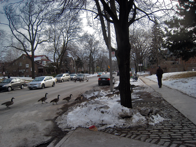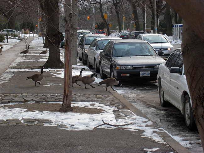 Yesterday on my walk to the subway I saw an enormous flock of geese who seemed to be taking a break from their migration route. Conservatively, I would guess at least 200 of them. I am not a huge fan of geese (they would take over the pond at my grandparent’s cottage every year and destroy it with their poop), but seeing so many of them at once and all the traffic at a dead stand still while they slowly saunter across the street, well, I had to dig my camera out and take a couple pictures. The fourth picture is especially great, 2 rows of geese with all the cars stopped!