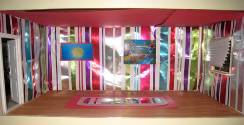 I’ve also decorated (temporarily) the living room. I used Christmas wrapping paper on the walls and construction paper on the ceiling. I made a blind by folding paper and using a needle and thread to hold it in place. The paintings might look familiar-photos of the originals trimmed down. The “rug” is more paper. I’ve also been working on a beaded curtain, but I think that might be for the downstairs bathroom (the middle small room).