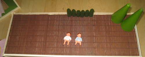 As you can see, I also amused myself by crocheting shrubbery. Only about another 70 to go. I was also thinking about embroidering fabric to look like the garden, but I don’t know if I am that talented. Maybe I could just crochet that too. The babies are a little too big for the scale of the house, but the 2 cone trees look kind of cool to me.