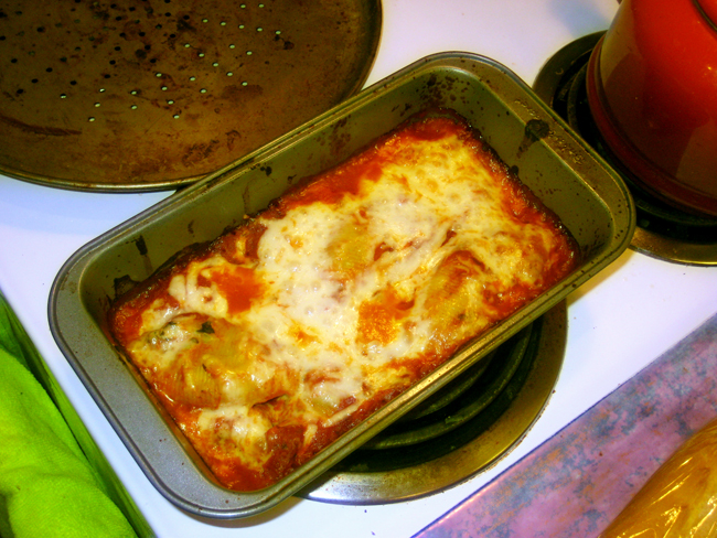 I was going to make it into spaghetti pie (which uses cooked spaghetti mixed with an egg for a crust and then the ricotta on top, with sauce and cheese) but Shannon thought it sounded HORRIBLE so I went with what I knew is an easy hit.