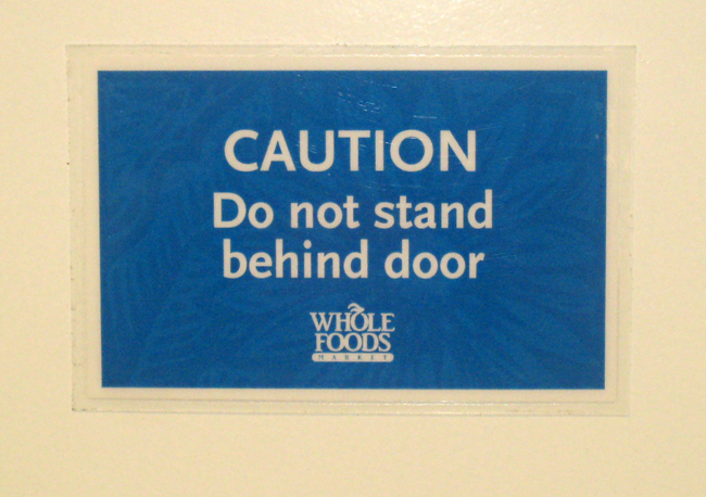 I picture someone just…standing inside the washroom and getting bashed by another person in a hurry and then complaining to management. “There should be a sign, warning people about the hazard of standing near a door!” Ay. What has this world come to?