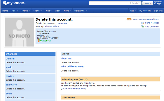 I’d tried to delete my myspace page a couple months ago but wasn’t able to  because I couldn’t remember the password for the email that I’d used to sign up. It’s my oldest email address and I think that it may be completely dead. So after I read an article on boingboing about people who were unable to delete their…some social networking thing…pages, I followed suit and am hoping that one day it just disappears. I still need to delete all the comments from friends-the most recent one was over a year ago which tells you how important it’s been to me.