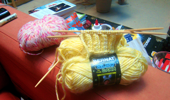 This glow in the dark yarn’s been around for a long time now and up until yesterday, I’d avoided it. Although I’d looked at it many times because I have a deep, abiding love for all things glowy. It’s on sale at Zeller’s (and everywhere, I think) for half the original price so I went for it, 2 balls of the yellow “light bright” yarn. I’m knitting (!) it into mittens for myself-how cool will that be?