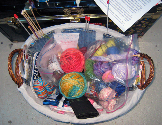 Here’s my current stash basket, full of beautiful yarn, needles, patterns, yarn labels, snips, magazines and candy-everything a knitter needs. It’s an old laundry basket, lined with cotton, and I sewed pockets from retired jeans around the perimiter to use as needle holders. I also got a makeup brush holder from Body Shop and use that for smaller dpn’s.