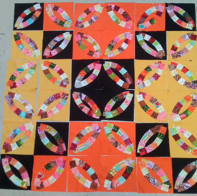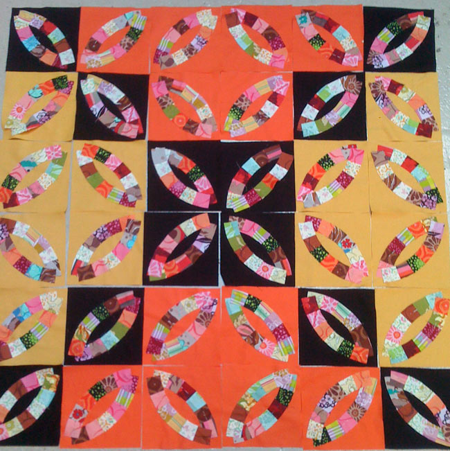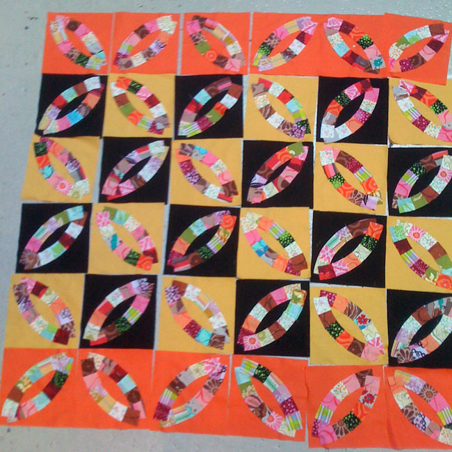 The further possibilities (although time is a huge factor, I’ll be sewing on Tuesday) are to get rid of a colour (probably the orange) and just do a black and yellow checkerboard or stripes or…Agg. It’s endless. AndĀ I wish I’d also bought red fabric.