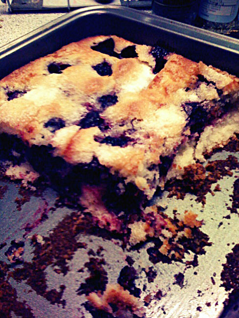 Butter a baking dish (I used an 8×8 square dark metal pan) and pour in batter, sprinkle in berries and 1/4 C sugar over top.