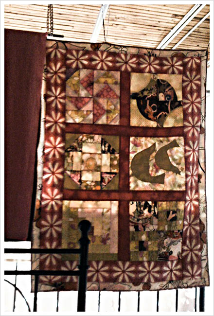 I hung my first quilt-the sampler-in my bedroom to block out early morning sunlight. It streams in and lands right on my sleeping face. The way it hits the quilt is so pretty.