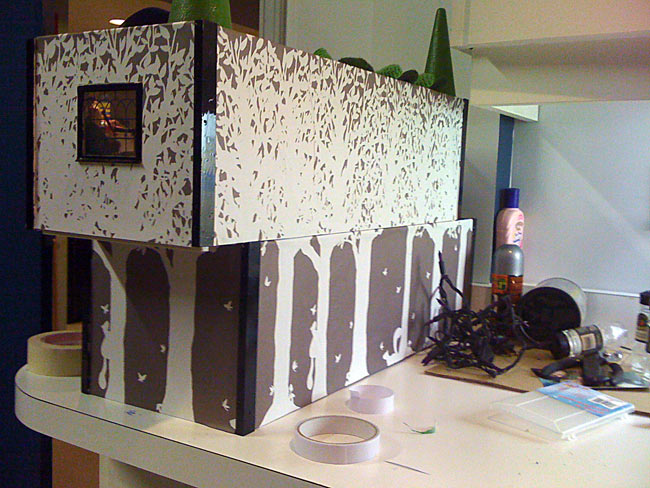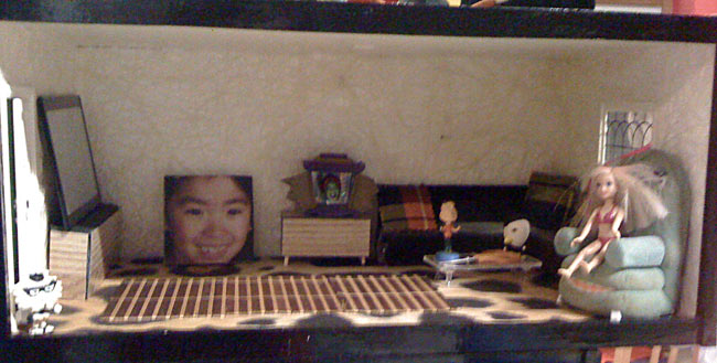 Chairry! And Jambi! And Cool Cat and Chicky Baby (but no Dirty Dog, couldn’t find him)! The rug is 3 coasters from the dollar store, sectional sofa made from foam rubber and upholstered in dark green velvet, flat screen tv is a piece of glass painted with silver with black electrical tape around the edge and the wood furniture is more foam rubber with ‘wood’ tiles stuck on. 3 plaid wool cushions. “Glass” table made of acrylic with clear thumb tack (minus the pointy part) legs.