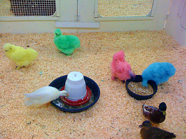 I read that they are dyed in utero, while still in the shell, I guess that’s less inhumane than painting them with Manic Panic after.