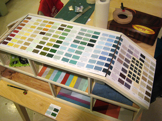 The interior will continue with the paint chip theme, using larger pieces. And I got some wood laminate for the floors, I’ll dye it to match.