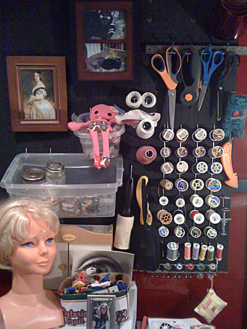 I also organized my sewing area a little. There was peg board laying around here, in the laundry room, so I hung it up and Shannon got me a bunch of pegs and it’s fantastic. So nice to have easy access to thread and bobbins and everything useful.