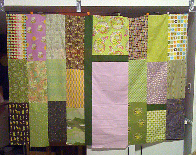 So between them and the shirts I’ve also put together a scrappy back for my green quilt. It’s not quite finished, I’m planning on getting some yardage tomorrow at the workroom to put a band at the bottom to fill it out to the right size. Or maybe a strip at the top and at the bottom, who knows. I’ve also made the binding for it, it’s also scrappy (surprise surprise!) different orange pattern fabrics.