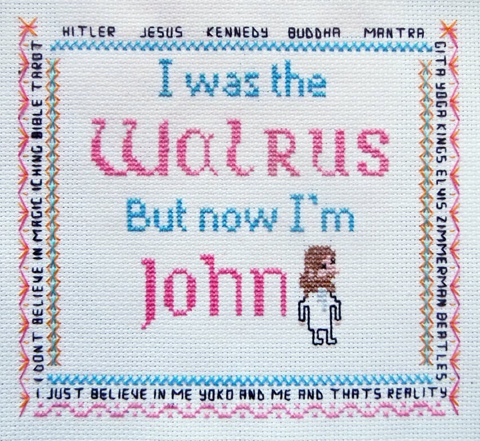 I’d picked up cross stitching (and put it down again, probably permanently) and after a couple small pieces, made this. The word are from his song “God” and the image of John is an iotacon.