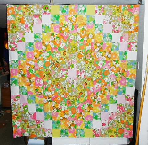 In crafting news, I finally figured out what to do with all those vintage sheet squares I cut with no plan: a traveller! Yes, I realize I didn’t put it together using traditional techniques, but I do think I’m close enough. It looks very perky and girly me. I won’t talk about how strip piecing nearly drove me bananas, my stitch ripper got a workout.