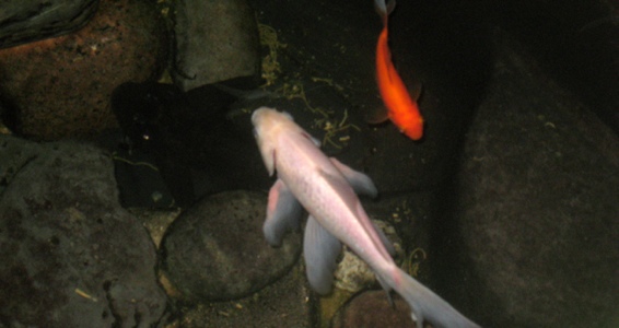 Then something even worse happened. By the time I got home from work Kelly had also wedged herself under the rocks. How could this be happening?? Both fish in one day? I agonized over what I’d done the day before, which was rinse the filter and top up the pond, but I do those things all the time and nothing terrible had happened. So I readied myself and asked Ari to do the dirty work. Unlike me, she isn’t squeamish about touching dead things . So she lifted the rock…and Kelly swam out. She wasn’t dead but she wasn’t ok either. It was clear that she was missing her old friend and protector. She sulked for 2 days under those rocks. She didn’t even beg for breakfast. Awful, so heart breaking. So, I got her a friend. His name is Dylan and he is a little smaller than Kelly. It’s hard to say how friendly they are, she tries to hide under him but she is too fat. He races around the pond, he is getting to know his new surroundings. I’m trying to give him space to settle in but it looks good, Kelly is out of hiding.